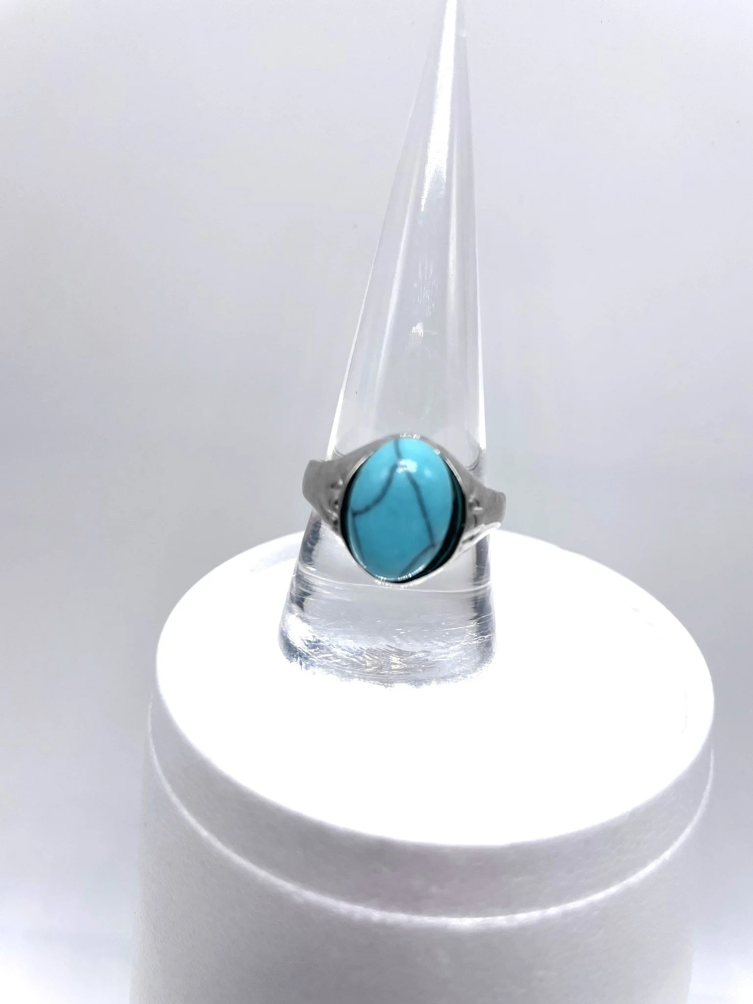 This Turquoise and Silver Ring is a beautiful and unique piece that adds a touch of boho chic to any outfit. The ring features a round turquoise stone set in a simple silver band. The vibrant blue-green color of the turquoise is both eye-catching and calming. This ring is perfect for everyday wear or for special occasions.