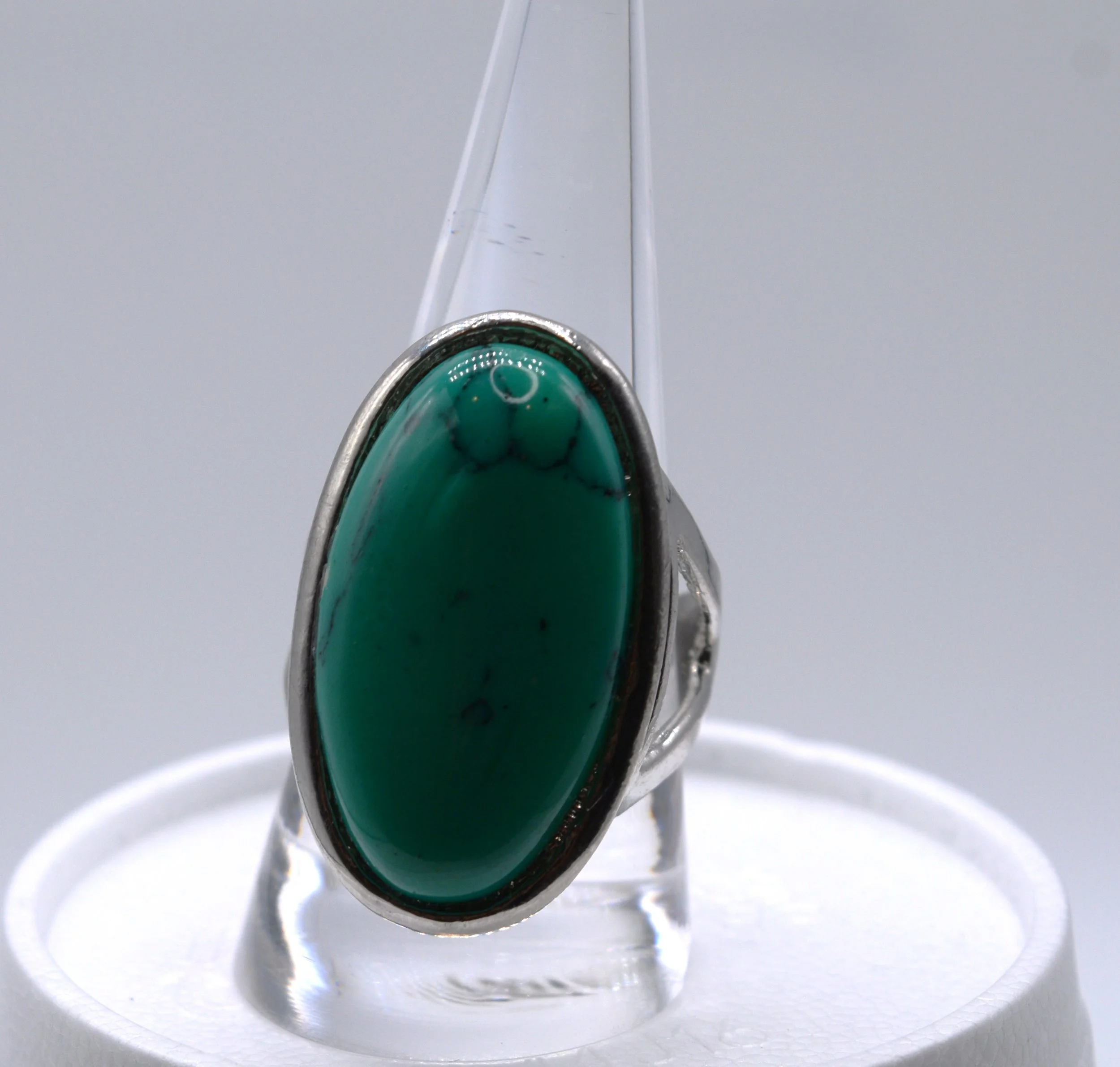 This classic oval turquoise ring is a timeless piece that adds a touch of elegance to any outfit. The ring features a beautiful oval-shaped turquoise stone set in a simple silver band. The vibrant blue-green color of the turquoise is both eye-catching and calming.