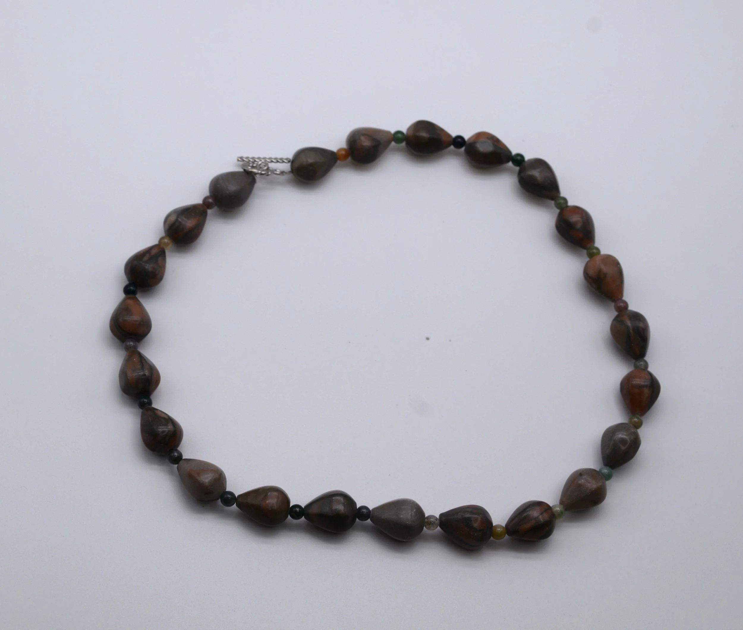 This earthy teardrop stone necklace is a stunning piece that adds a touch of natural beauty to any outfit. The necklace features a series of teardrop-shaped stones in shades of brown and gray, creating a calming and earthy aesthetic. The simple silver clasp adds a touch of elegance. Perfect for everyday wear or special occasions.